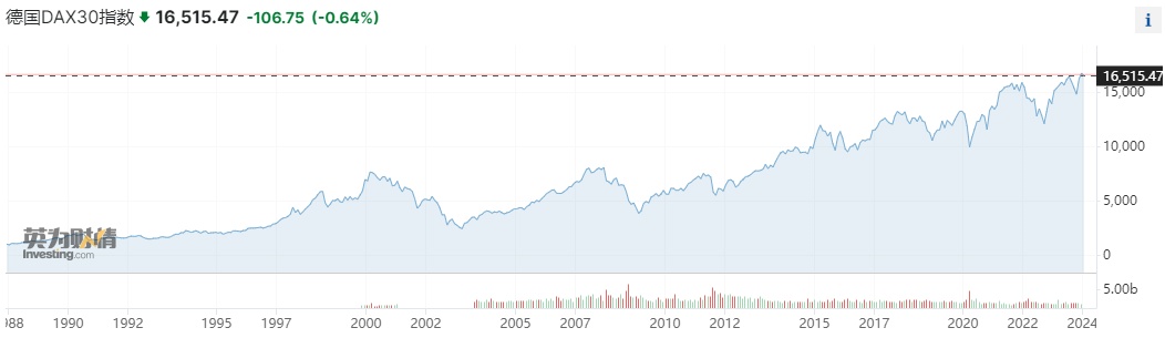 在充满挑战的全球经济环境中,德国成为去年表现最差的主要经济体之一。根据德国联邦统计局的初步计算,2023年经价格调整后的国内生产总值(GDP)萎缩0.3%。高通胀、利率上升和能源成本上升等因素严重阻碍了零售、出口和工业生产等部门的发展。尽管面临经济挑战,但代表德国市值最大的40家企业的DAX指数上月突破了16500点大关,创下新高。
