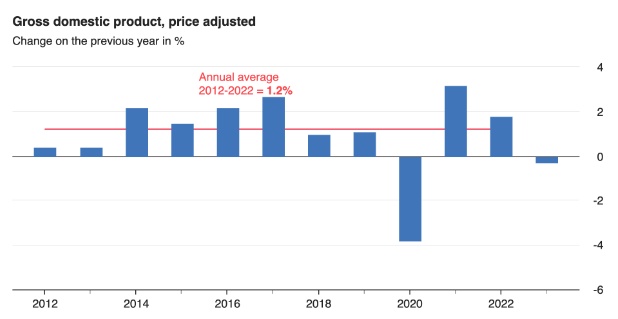 德国政府对经济前景保持乐观,预计2024年GDP将增长1.3%。另一方面,经济合作与发展组织(OECD)预计德国今年GDP仅会小幅增长0.6%。根据2023年11月29日公布的数据,这明显低于38个OECD成员国1.4%的平均增长率。令人失望的表现引发了一场关于德国是否再次成为“欧洲病夫”的辩论——德国在1990年代两德统一后首次获得这个绰号,当时该国经济增长乏力,失业率居高不下。
