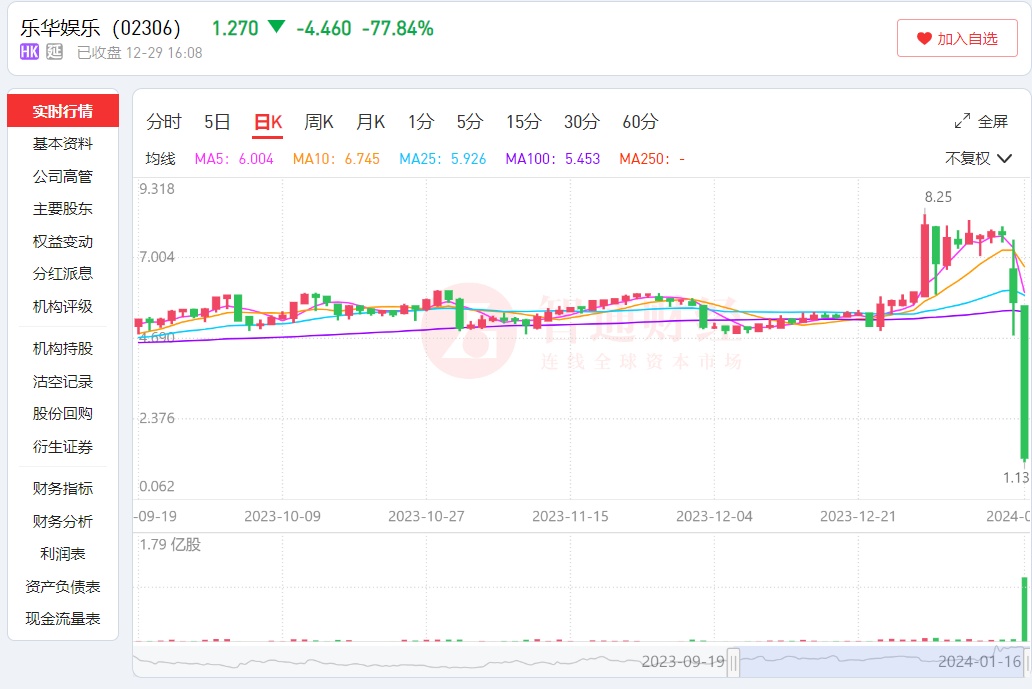 智通财经APP获悉,有“王一博概念股”之称的港股乐华娱乐(02306)股价闪崩,引发市场关注。1月16日乐华娱乐(02306)早盘大跌,在开盘约一小时后跌近80%,创上市以来新低,#乐华股价暴跌近80%#的话题随之登上微博热搜榜第一位。截至收盘,该股跌77.84%,报1.27港元/股。昨日,该股跌超25%,近两日累计跌超81%。对此,乐华娱乐暂无回应。