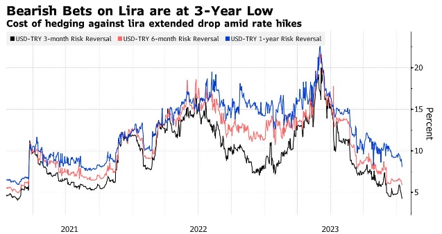 智通财经获悉,随着土耳其央行加息和其他政策措施帮助提振投资者信心,进一步做空土耳其里拉的需求正在慢慢消失。期权市场对冲未来三个月里拉贬值的成本已降至2021年2月以来的最低水平。这些风险逆转期权——远期市场情绪的晴雨表——在6个月和1年期合约中也出现了类似的下跌,表明投资者缺乏针对里拉走软的头寸需求。