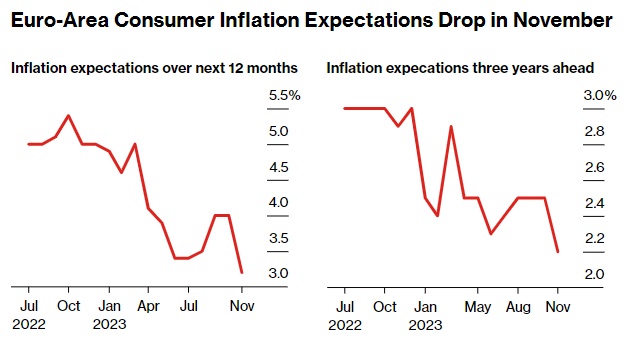 智通财经获悉,11月,消费者对欧元区通胀的预期降至逾一年半以来的最低水平,这支持了市场认为欧洲央行可能很快就会降息的观点。欧洲央行周二公布的月度调查显示,11月消费者的一年期通胀预期“明显下降”,从4%降至3.2%;三年期通胀预期从2.5%降至2.2%。