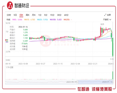 两周后的1月15日,攀上新高不久的乐华娱乐突然“翻脸”,盘中跌幅最大时逼近38%,截至收盘报5.73港元,跌幅25.39%。次日,乐华娱乐再度上演“高台跳水”戏码,早盘股价低开低走,跌幅一度超过80%。截至当天收盘,乐华娱乐报收1.27港元,跌幅77.84%,股价直接跌穿至历史新低。