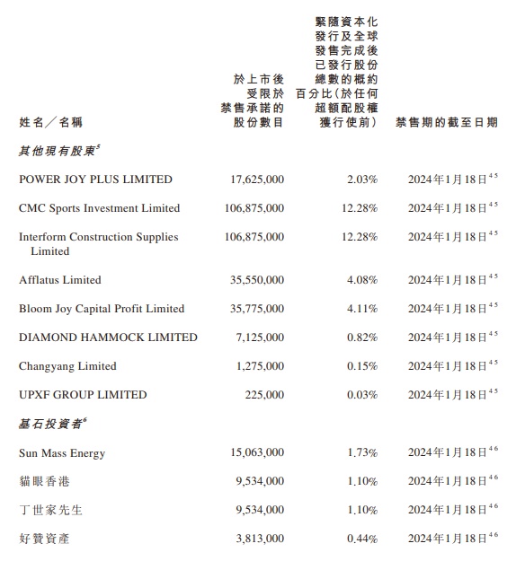 乐华娱乐的招股书显示,该公司在上市时引入了多位基石投资者,包括Sun Mass Energy、猫眼香港、丁世家以及好赞资产。根据禁售安排,基石投资者认购的发售股份受到上市日期起12个月的禁售规定;同时,截至招股章程日期,除方舟信托(香港)有限公司及盛石信托(香港)有限公司外,乐华娱乐的其他现有股东均已订立禁售承诺协议,禁售期亦为自上市日期起计为期12个月。