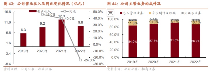 数据显示,2019-2022年乐华娱乐的收入分别为6.3亿元(人民币,单位下同)、9.2亿元、12.9亿元、9.8亿元,期间复合年增长率约为15.8%,其中2022年收入同比降幅为24%。分业务看,艺人管理业务是乐华娱乐的最主要收入来源,期内该业务的收入占比分别为84%、87.7%、91%、86.9%。