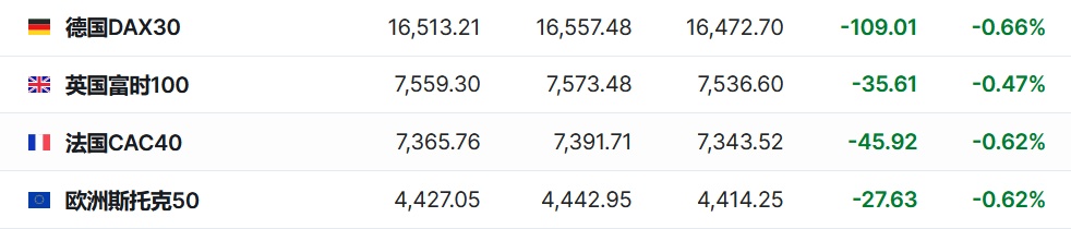 2.截至发稿,德国DAX指数跌0.66%,英国富时100指数跌0.47%,法国CAC40指数跌0.62%,欧洲斯托克50指数跌0.62%。