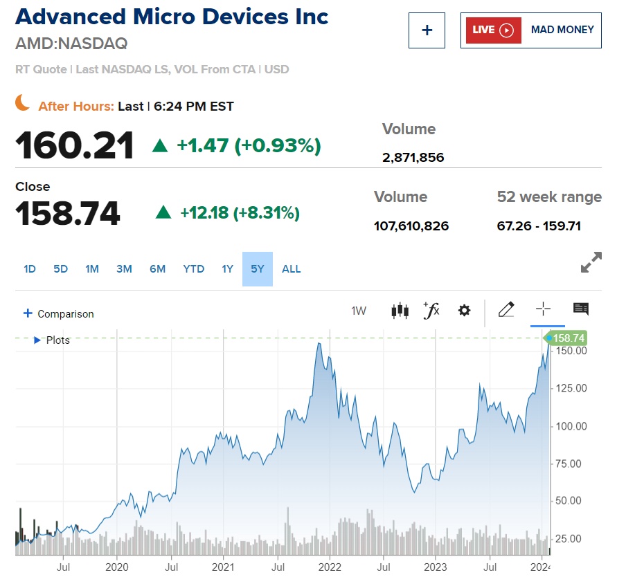 AMD周二收于158.74美元,较该股历史最高点低约2%。英伟达则上涨3%,至563.82美元。英伟达占据了人工智能芯片市场的绝大部分份额,是去年标普500指数中表现最好的股票。