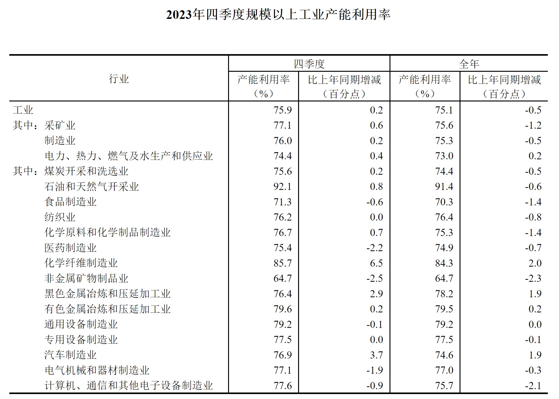 分主要行业看,2023年四季度,煤炭开采和洗选业产能利用率为75.6%,食品制造业为71.3%,纺织业为76.2%,化学原料和化学制品制造业为76.7%,非金属矿物制品业为64.7%,黑色金属冶炼和压延加工业为76.4%,有色金属冶炼和压延加工业为79.6%,通用设备制造业为79.2%,专用设备制造业为77.5%,汽车制造业为76.9%,电气机械和器材制造业为77.1%,计算机、通信和其他电子设备制造业为77.6%。