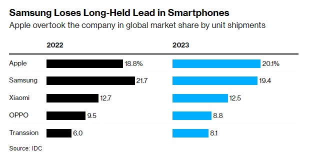 智通财经APP获悉,根据最新数据显示,苹果(AAPL.US)首次超越三星电子(SSNLF.US),成为全球智能手机市场的领头羊,这也是三星自2010年以来首次失去榜首的位置。