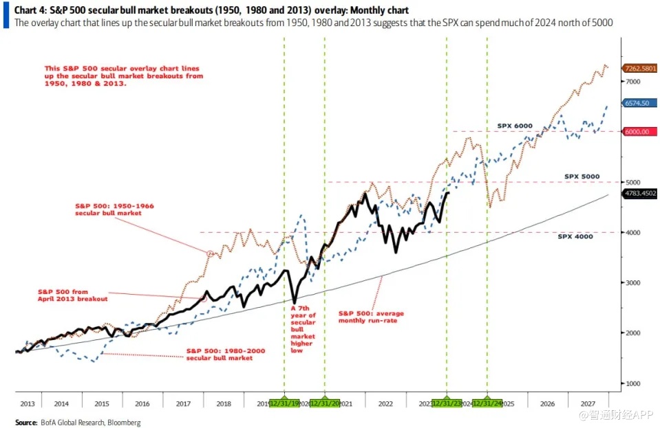 Suttmeier表示:“从长期牛市的叠加图来看,标普500指数在2024年的大部分时间里可能会在5000点以上。这证实了标普500指数分别接近5200点和5600点的看涨模式。”