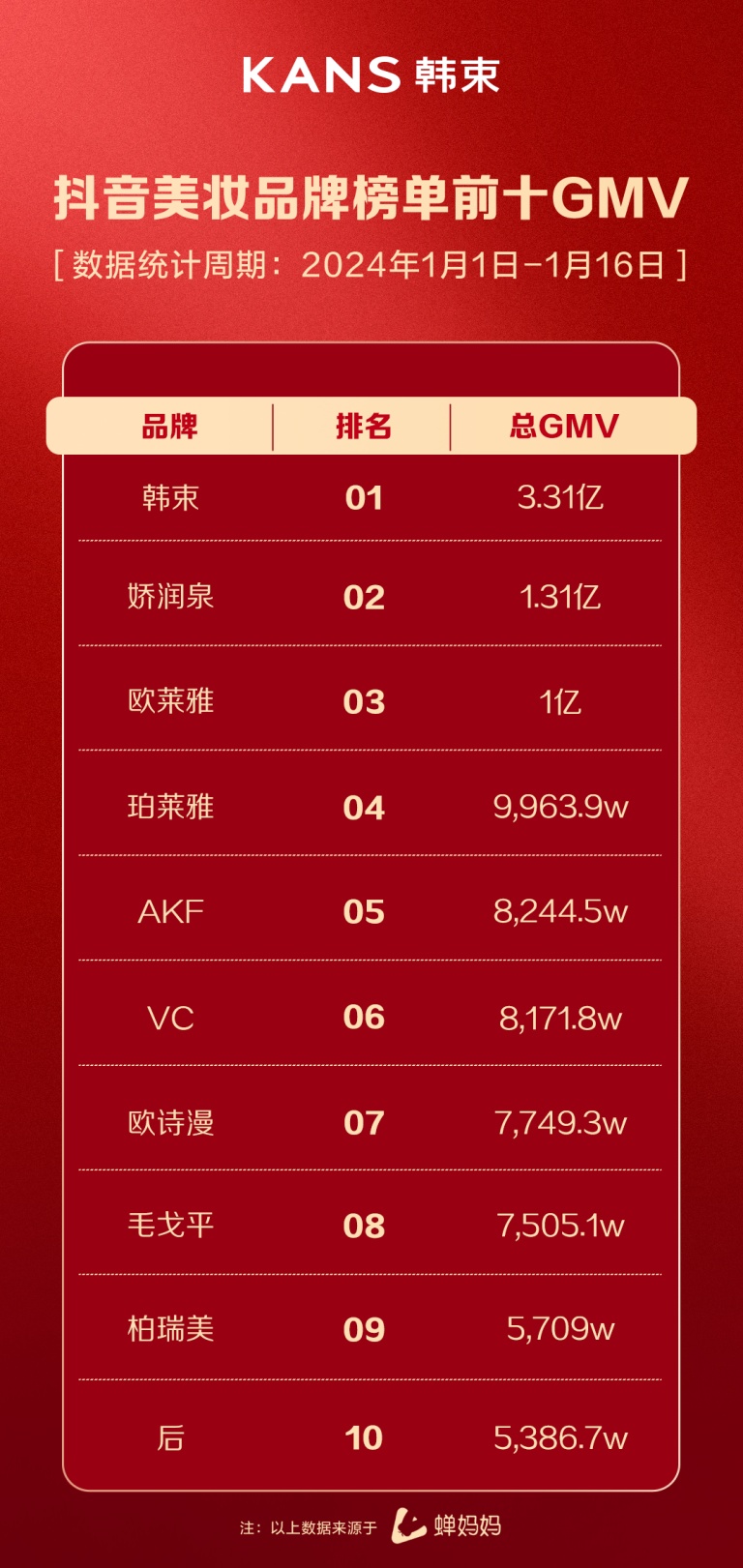 智通财经APP获悉,第三方平台数据显示,2024年1月1日-1月16日,抖音美妆开年势头依旧,品牌榜榜首韩束抖音半月GMV破3.3亿元,延续强劲增长势能,位列抖音美妆类目第1。据此推算,本月GMV有望破6亿。