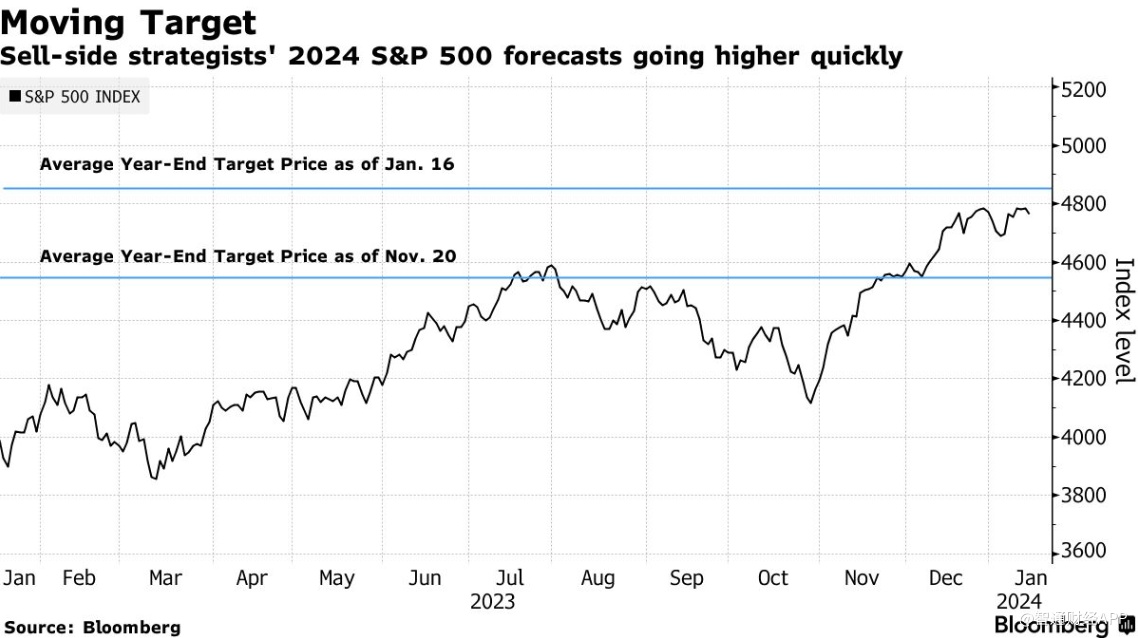 截至1月16日,Bloomberg追踪的卖方策略师的平均目标点位为4851点,而去年11月底为4546点。
