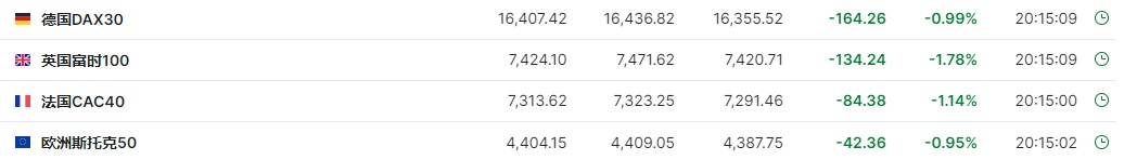 2.截至发稿,德国DAX指数跌0.99%,英国富时100指数跌1.78%,法国CAC40指数跌1.14%,欧洲斯托克50指数跌0.95%。