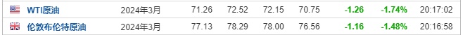 3.截至发稿,WTI原油跌1.74%,报71.26美元/桶。布伦特原油跌1.48%,报77.13美元/桶。