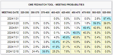 数据公布后,市场继续交易员削减对2024年美联储降息的押注。根据CME美联储观察工具,市场目前预计美联储3月降息的可能性为59%,此前为70%。美国10年期国债收益率攀升至今年最高水平,现报4.10%。美国股指期货延续跌势。美元指数DXY短线走高14点,现报103.54。现货黄金短线走低6美元,现报2020.39美元/盎司。