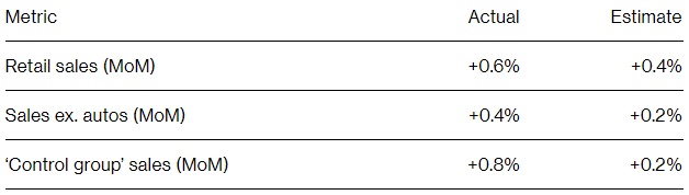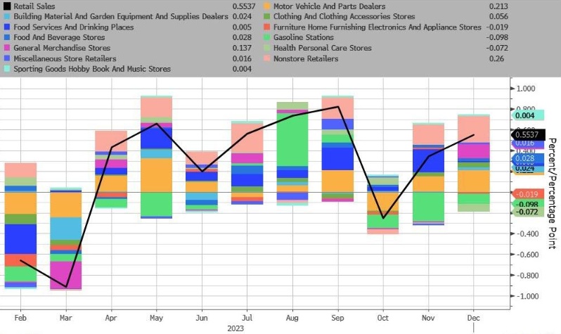 智通财经获悉,由于服装和配饰店以及网上非实体店业务的增长,美国12月零售销售环比增长0.6%,高于预期的0.4%,前值为0.3%。美国12月零售销售(除汽车)环比增长0.4%,预期为0.2%,前值为0.2%。美国12月零售销售(除汽车与汽油)环比增长0.6%,预期为0.3%,前值为0.6%。