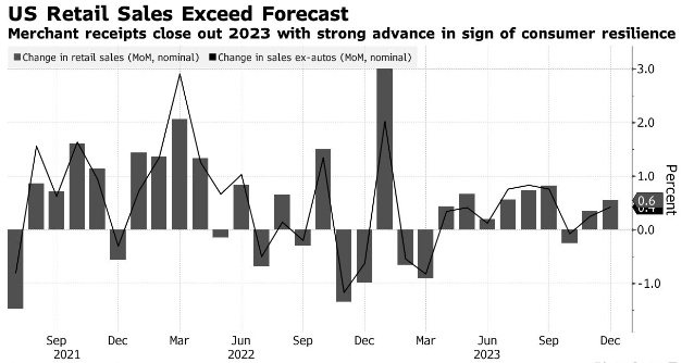 由于美国消费者继续推动经济持续扩张,12月份零售额增幅远高于11月份,进而有望全面延续近期多项经济数据所反映出的“软着陆”趋势。近期公布的非农就业数据以及初请失业金数据均暗示美国劳动力市场韧性十足,使得市场愈发相信美联储能够在抗击通胀的同时,不伤及美国就业市场,这正是“软着陆”的最核心。