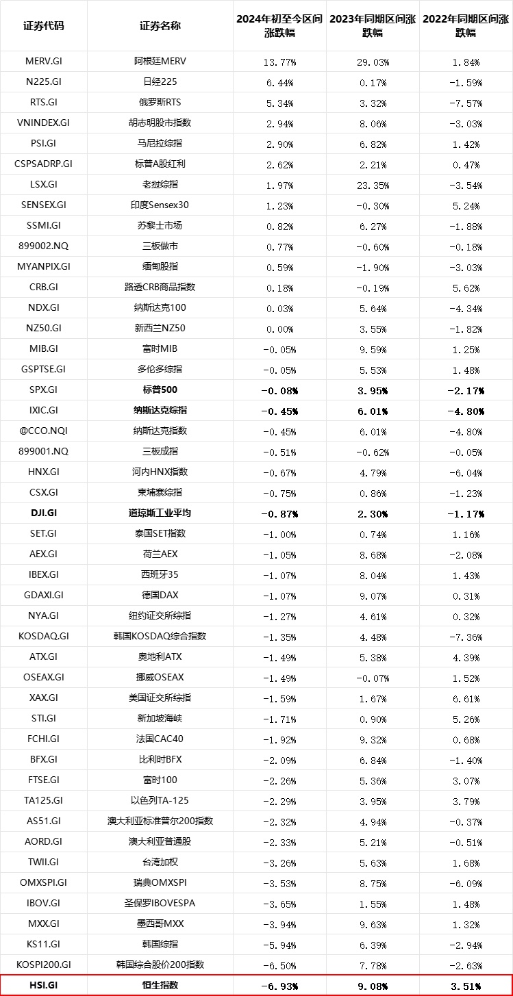 自2024年开年以来,港股市场行情表现持续震荡试低。截至1月17日收盘,恒指收报15276.90点,跌幅3.71%。年初至今(1月17日),恒生指数已累计跌幅达6.93%,成为2024开年以来全球市场中跌幅最大指数。