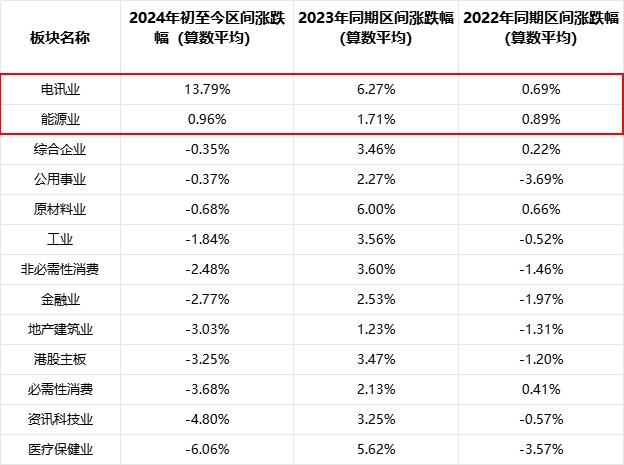 回顾今年开年以来港股各板块的各自表现,防守性较高的高分红板块,电讯、能源板块跑出了上涨行情,其中,电讯业以13.79%涨幅领涨各板块;相比之下,医疗保健、资讯科技、必需性消费板块则于开年来领跌,其中医疗保健板块跌幅超6%。