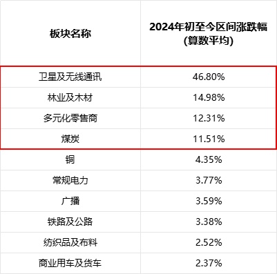 从具体细分来看,年初以来,在恒生行业分类的95个行业中,有24个细分领域实现了正增长,10个细分领域涨幅超过2%。其中,卫星及无线通讯、林业及木材、多元化零售商、煤炭四个板块涨幅超过10%。