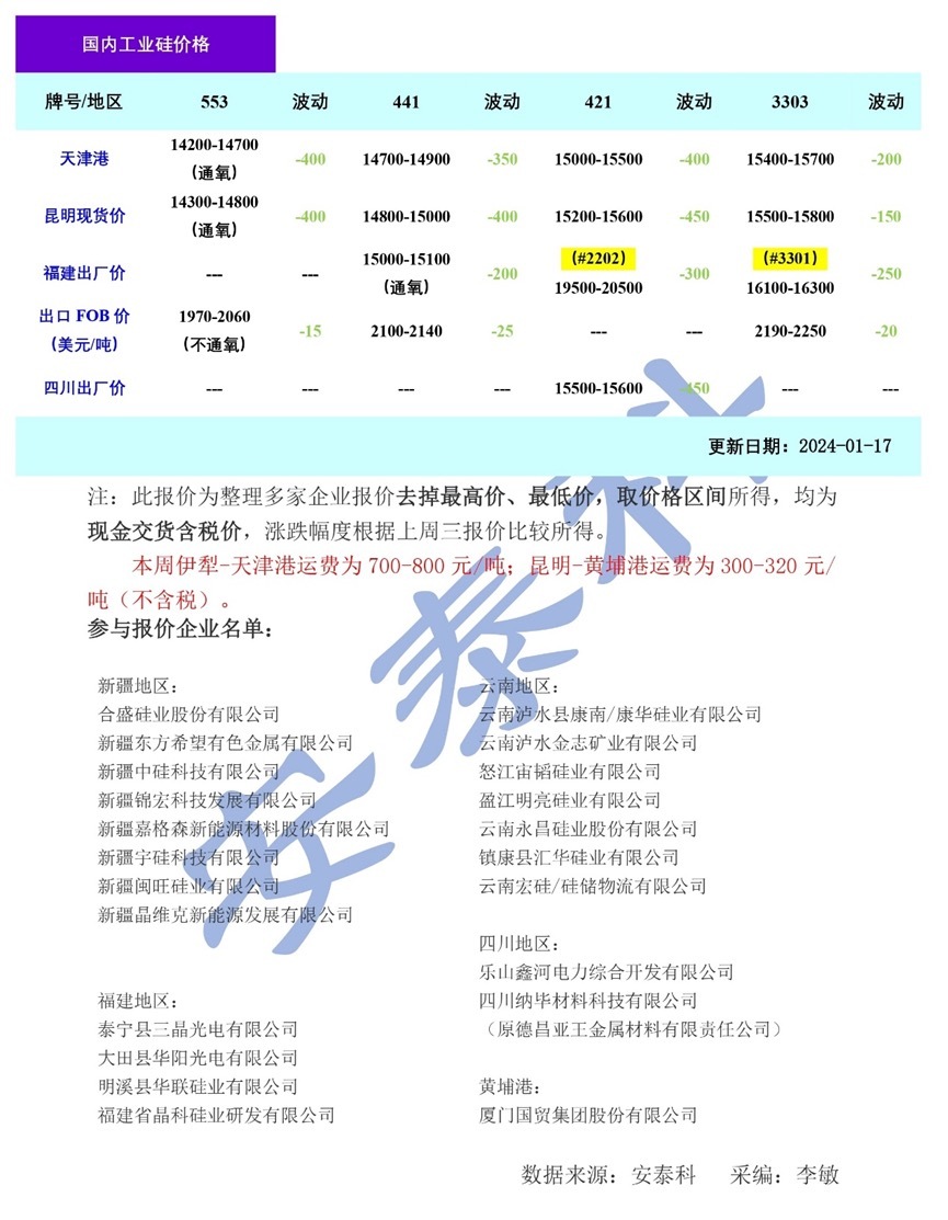 智通财经APP获悉,1月17日,硅业分会发文称,本周工业硅现货价格整体下跌。冶金级工业硅主流价格14200-15000元/吨,下跌350-400元/吨,化学级工业硅主流价格为15000-15800元/吨,下跌150-450元/吨。过去一周(1月11日-17日),工业硅主力合约2403收盘价格从13875元/吨一路下跌至13425元/吨,共下跌450元/吨,跌幅为3.24%。FOB价格下跌15-25美元/吨。