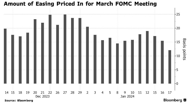 市场暗示的3月份降息可能性出现最新变化,部分原因是美国12月份零售销售数据强于预期。这也反映出英国短期债券遭遇抛售,此前比预期更热的国内通胀数据促使交易员预期英国央行今年不会采取宽松政策。