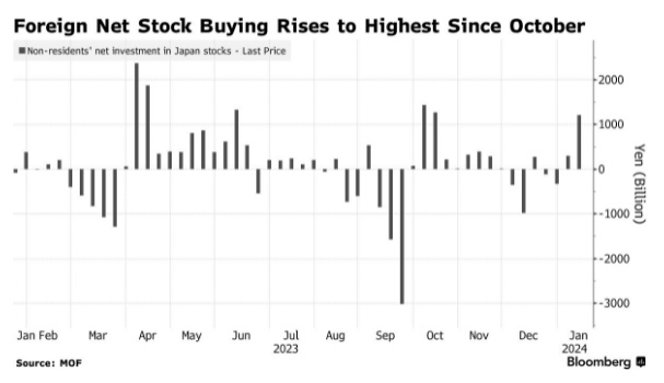 智通财经APP获悉,日本财务省周四公布的数据显示,外国投资者上周净买入1.2万亿日元(合81亿美元)的日本股票,这是自去年10月以来的最大买入额。