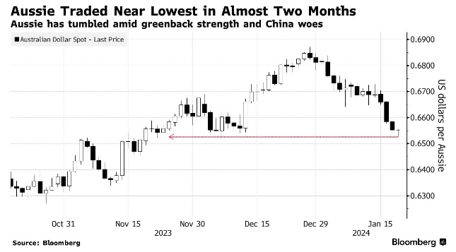 澳大利亚12月就业意外下滑,结束了四个月的涨幅,澳元走低,因交易员加大了对澳联储今年转向宽松政策的押注。