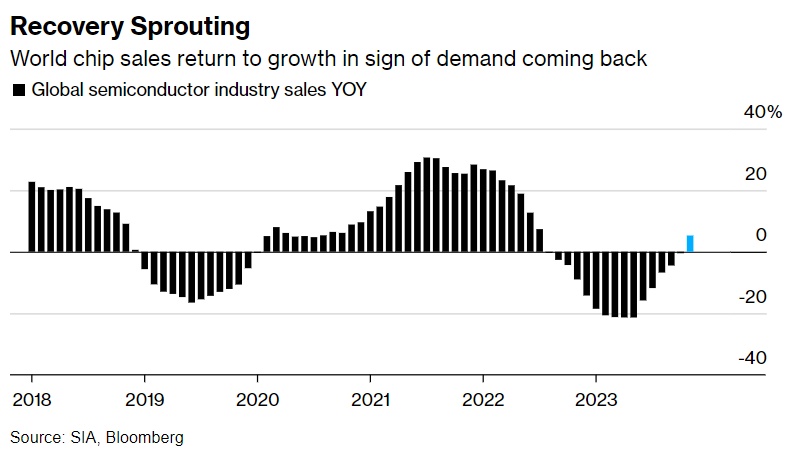 最近几周,芯片制造行业出现了复苏迹象。半导体行业协会(Semiconductor Industry Association)估计,在经历了一年多的下滑后,去年11月芯片销售出现增长。