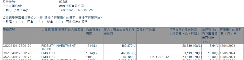 智通财经APP获悉,香港联交所最新资料显示,1月12日,FMR LLC增持泉峰控股(02285)4.71万股,每股作价20.1342港元,总金额约为94.83万港元。增持后最新持股数目约为5111.91万股,最新持股比例为10.00%。