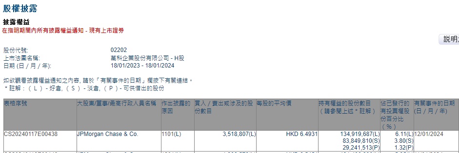 智通财经APP获悉,香港联交所最新资料显示,1月12日,小摩增持万科企业(02202)351.8807万股,每股作价6.4931港元,总金额约为2284.80万港元。增持后最新持股数目约为1.35亿股,最新持股比例为6.11%。