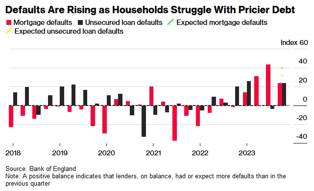 此外,调查还揭示了英国央行连续14次加息给家庭带来的损失。抵押贷款和无担保贷款(包括信用卡)的违约率在去年第四季度上升,预计今年第一季度将再次攀升。去年年底,一个衡量抵押贷款违约损失的指数升至2009年以来的最高水平。