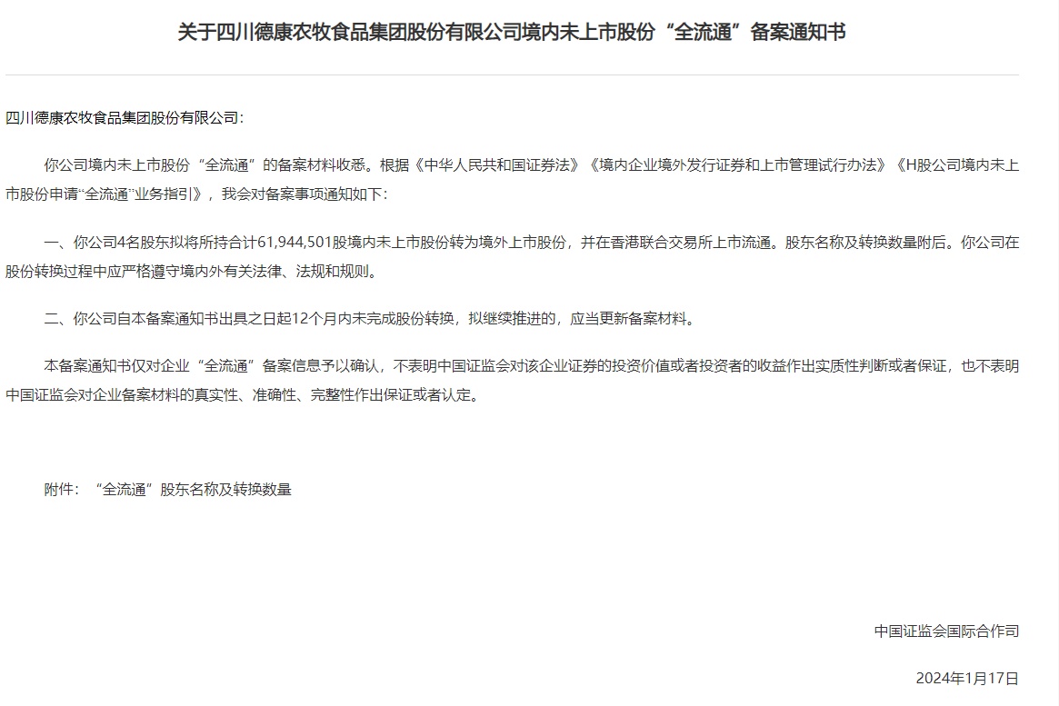 智通财经APP获悉,1月18日,中国证监会发布《关于四川德康农牧食品集团股份有限公司境内未上市股份“全流通”备案通知书》。该公司4名股东拟将所持合计61,944,501股境内未上市股份转为境外上市股份,并在香港联合交易所上市流通。据悉,2023年7月31日,德康农牧(02419)向港交所递交上市申请,中金公司和花旗为联席保荐人。