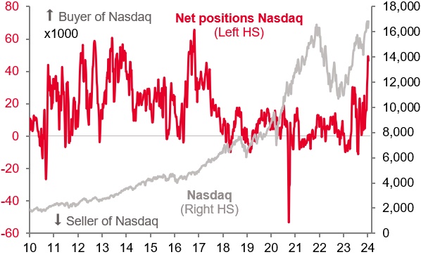 其中,法国兴业银行对纳斯达克100指数期货和小型合约的加权分析显示,根据商品期货交易委员会提供的数据,对冲基金持有近七年来最高水平的纳斯达克100期货净多头。