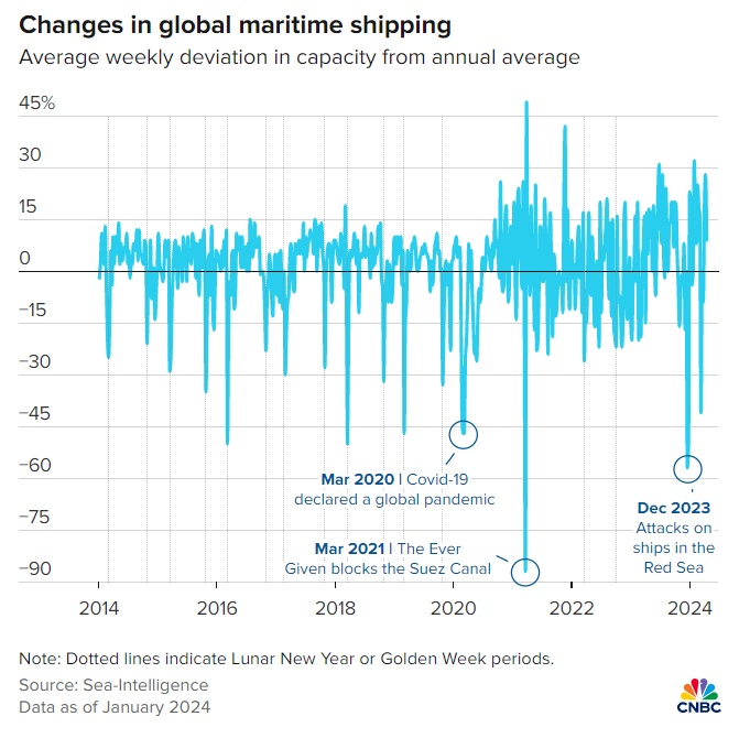 Sea-Intelligence首席执行官Alan Murphy表示,此次船舶运力下降是近年来第二大降幅。唯一比红海危机影响更大的事件是“Ever Given”号,这艘巨型货船于2021年3月在苏伊士运河被困了六天。在那次事件中,数十亿美元的贸易陷入停滞。Murphy称,除此之外,“这次(红海危机)是最大的单一事件,甚至比疫情早期的影响还要大”。