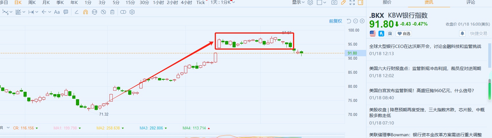 基于2024年美联储数次降息经济“软着陆”的预期,美国KBW银行指数自去年10月25日左右开始进入主升阶段,仅在36个交易日内便大涨33.21%,至12月15日开始了高位横盘震荡,等待业绩期的降临。
