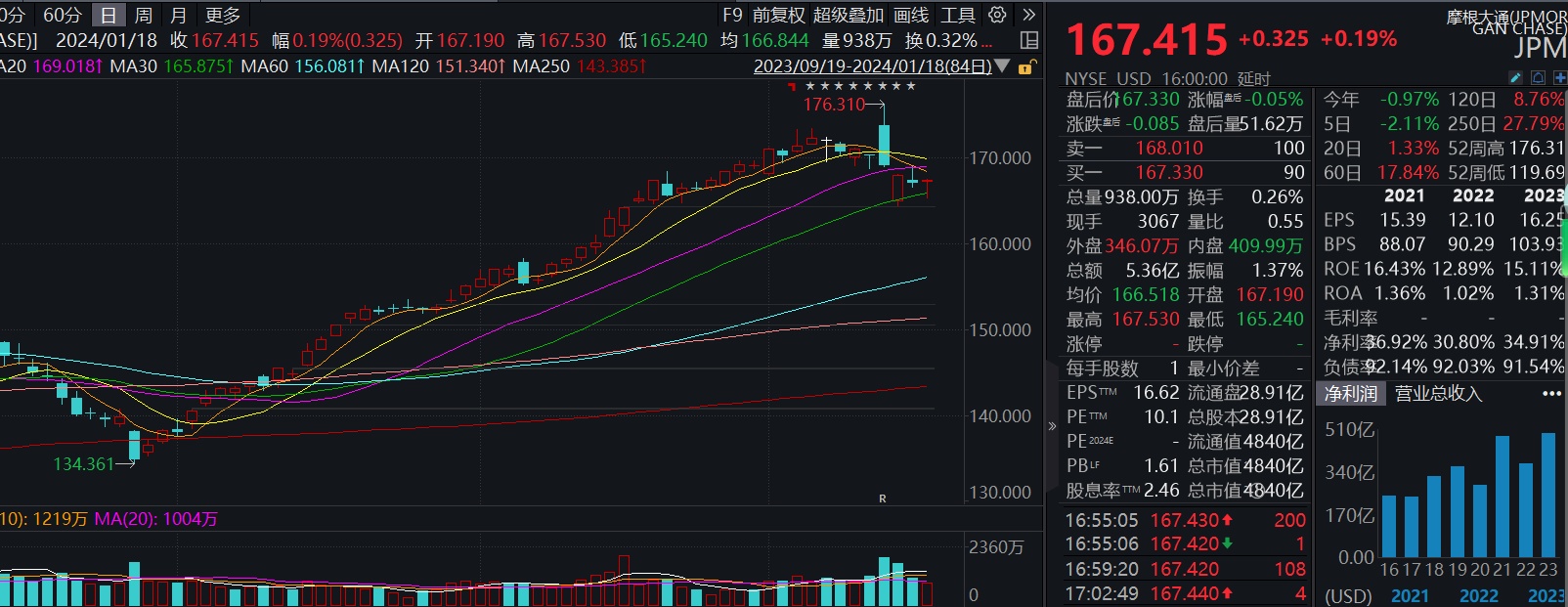 但业绩发布当天,摩根大通股价在冲高3.5%至176.31美元创新历史新高后便开始跳水,最终以微跌0.73%收盘,成交量亦显著放大,可见有部分资金已落袋为安。后续三个交易日股价微跌盘整,股价形态虽已跌破20日线,但仍在30日线上方。