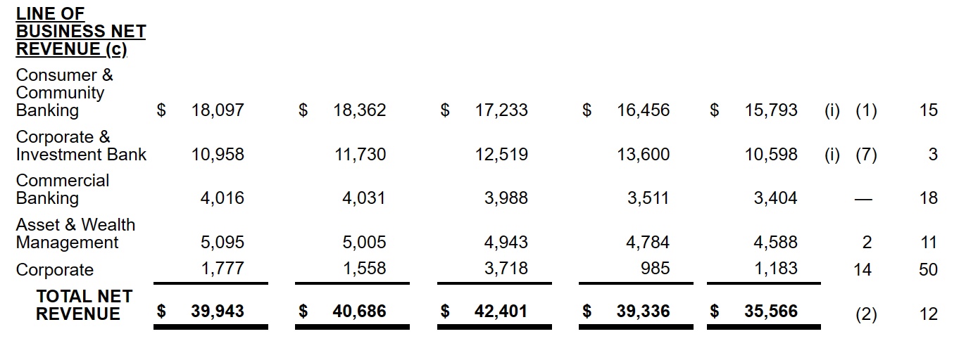 商业银行收入为40.16亿美元,同比增长18%,资产与财富管理业务收入为50.95亿美元,同比增长11%,这两大业务增速均符合彭博一致预期。由此看来,摩根大通整体收入的不及预期主要是因为企业与投行业务所致。