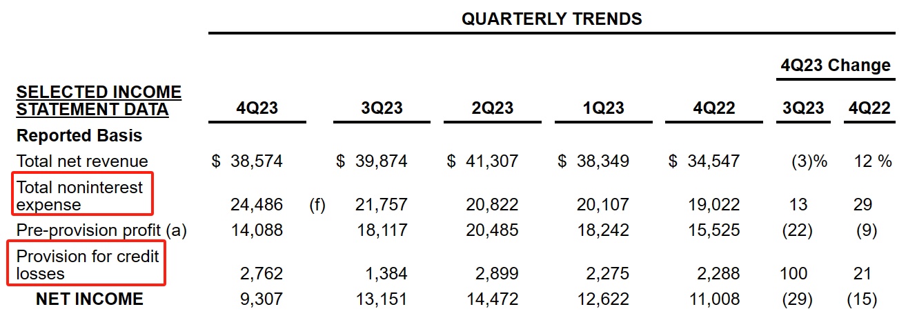 报告期内,摩根大通第四季度的非利息支出为244.86亿美元,上一季度为217.57亿美元,去年同期为190.22亿美元。无论是同比亦或是环比,非利息支出均大幅增长,并超出了分析师的预期。