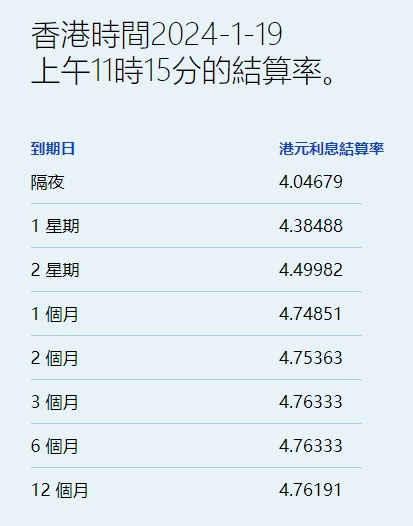 智通财经APP获悉,1月19日,港元拆息变动不大,但普遍回升,其中,隔夜息微升1基点至4.04679%,与楼按相关的一个月拆息结束七连跌,报4.74851%。不过一周钱连跌4天,今报4.38488%。
