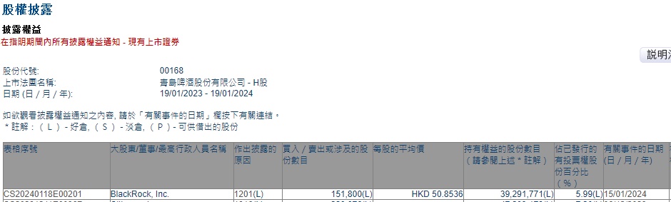 智通财经APP获悉,香港联交所最新资料显示,1月15日,贝莱德减持青岛啤酒股份(00168)15.18万股,每股作价50.8536港元,总金额约为771.96万港元。减持后最新持股数目约为3929.18万股,最新持股比例为5.99%。