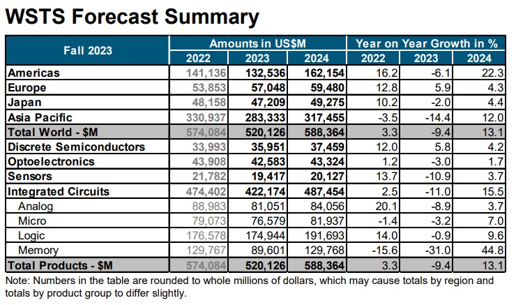 WSTS表示,展望2024年,全球半导体市场预计将达到5883亿美元,高于2023年春季预测的5760亿美元,这一扩张预计将主要由覆盖AI服务器、PC以及智能手机等应用的存储领域所推动,预计到2024年将上升至1300亿美元,与上一年相比增长超过40%;WSTS预计几乎所有关键类别,包括分立器件、传感器、模拟芯片、逻辑芯片和MCU等,预计都将呈现个位数增长。