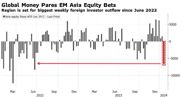 智通财经获悉,由于对美联储大幅降息的希望日益渺茫,打击了投资者对风险资产的信心,不包括日本等在内的亚洲新兴市场股市将出现自2022年6月以来最大单周资金流出。数据显示,本周迄今为止,全球投资者净抛售了66亿美元的股票,创下近19个月来最大的单周资金流出量。科技股密集的中国台湾股市和印度股市资金外流规模最大。