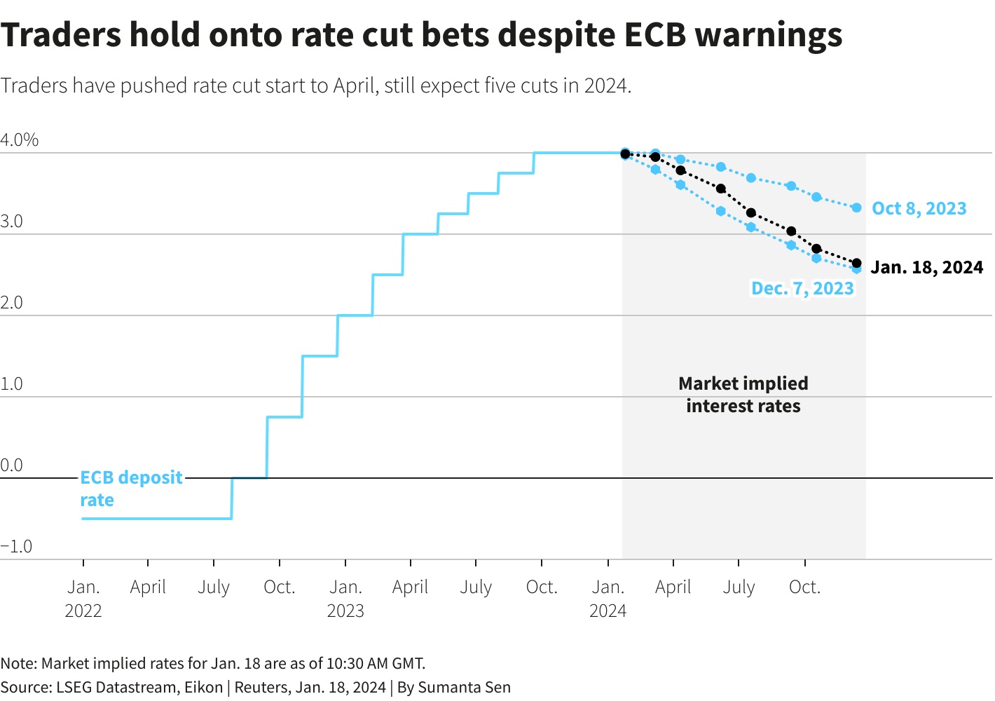 不过,货币市场显然没有放弃。市场已经基本消化了美联储将在5月降息25个基点的预期,且预计美联储在3月降息的可能性超过50%。此外,市场认为欧洲央行在4月首次降息的可能性仍然很大,尽管欧洲央行首席经济学家Philip Lane最近暗示降息最早将在6月。