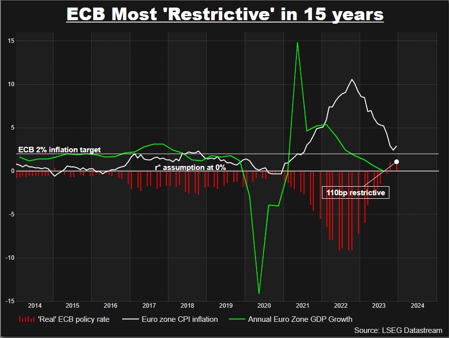 欧洲央行指出,中性利率是一个不可观察、难以捉摸的概念,但他们的2%的长期中性利率(即实际政策利率为零)的粗略假设意味着,目前的利率至少有着100个基点的“限制性”。