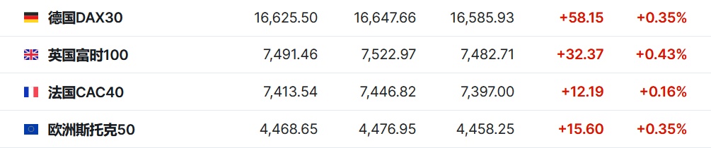 2.截至发稿,德国DAX指数涨0.35%,英国富时100指数涨0.43%,法国CAC40指数涨0.16%,欧洲斯托克50指数涨0.35%。