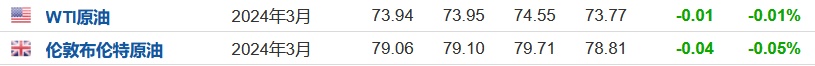 3.截至发稿,WTI原油跌0.01%,报73.94美元/桶。布伦特原油跌0.05%,报79.06美元/桶。