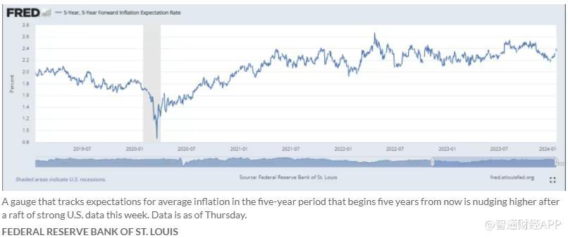 与此同时,根据圣路易斯联邦储备银行最近的数据,截至周四,五年-五年期远期通胀预期率上升至2.4%,高于今年年初的2.25%。虽然这一增长幅度看似不大,但上升的趋势才是关键所在。五年-五年远期利率被视为比密歇根大学周五报告的数据更及时的读数,后者显示未来一年的通胀预期降至2020年12月以来的最低水平。