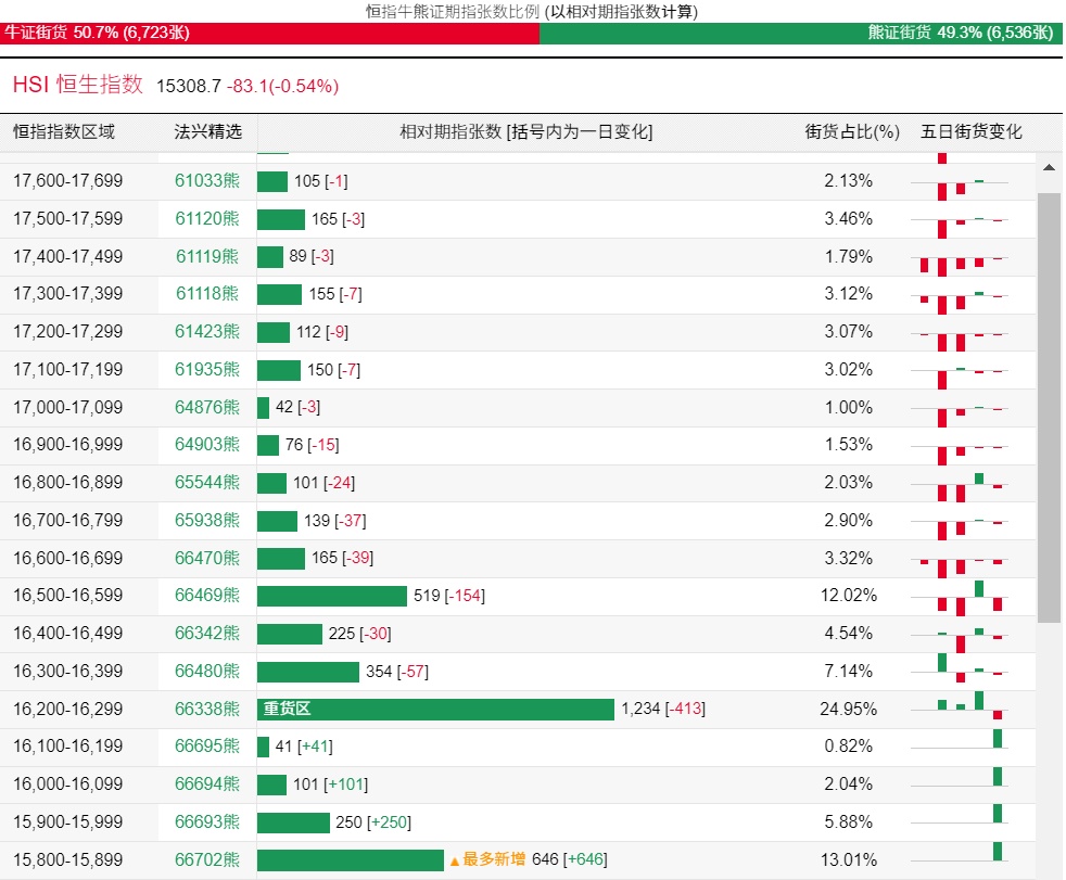法兴恒指牛熊证街货分布图中的数据显示,熊证街货重货区在16200-16299区间,该区间最新熊证数量为1234张,较上一交易日减少413张;最多新增在15800-15899区间,该区间最新熊证数量为646张,较上一交易日增加646张。
