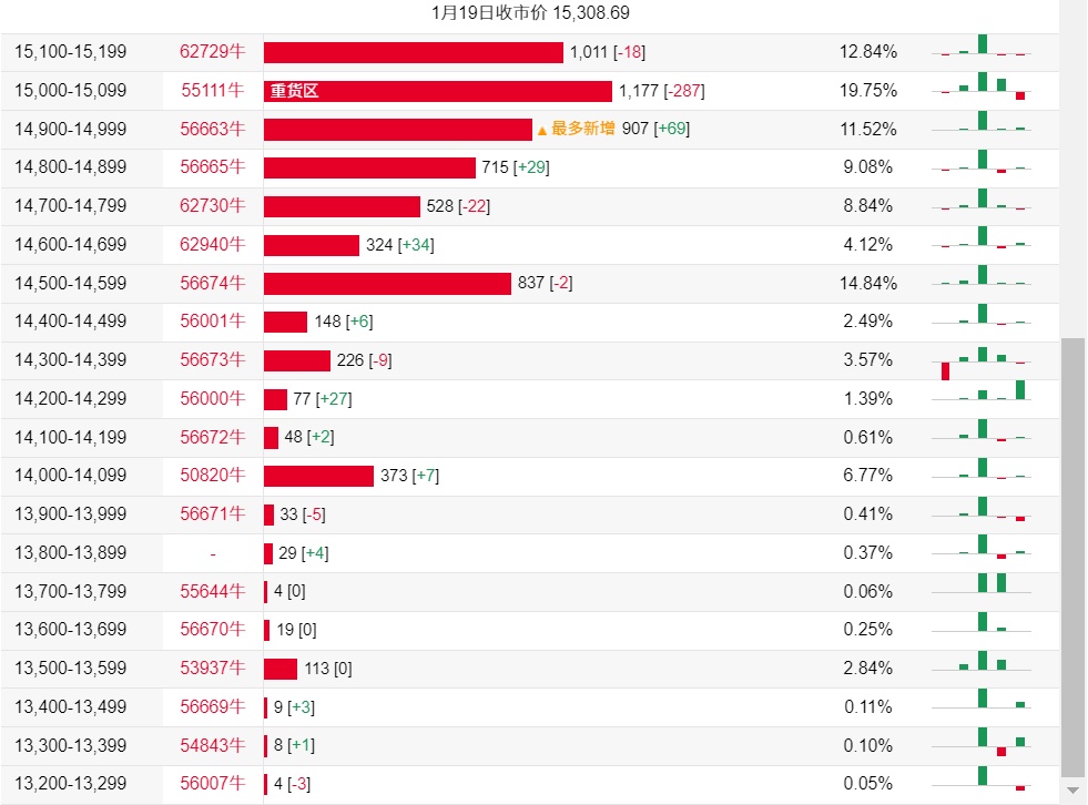 牛证街货重货区在15000-15099区间,该区间最新牛证数量为1177张,较上一交易日减少287张;最多新增在14900-14999区间,该区间最新牛证数量为907张,较上一交易日增加69张。