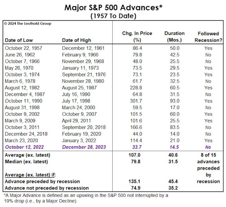 根据the Leuthold Group的数据,自1957年以来,标普500指数有16次大幅上涨,上涨的持续时间在很大程度上取决于之前是否出现了经济衰退。在经济低迷时期开始上涨的8个例子中,该指数在45个月内平均上涨了135%。但如果之前的下跌与经济衰退无关,那么随后的上涨就没有那么强劲,标普500指数平均上涨约75%,反弹持续的时间略少于三年。